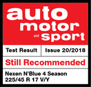The N'BLUE 4Season came 11th in the AutoBild All-Season Tyre Test 2020 among 32 tyres tested and received a "Good" result. The AutoBild team attested the N'BLUE 4Season a balanced performance level across all test categories. In particular, the testers were pleased with short dry braking distances, good aquaplaning characteristics, quiet rolling noise, good economy and high mileage.