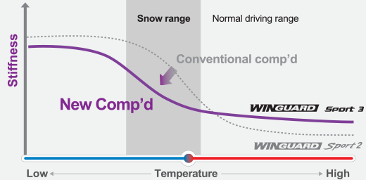 The low-temperature stable compound enhances snow performance by remaining flexible in the cold while maintaining stiffness at high temperatures for consistent, stable driving.